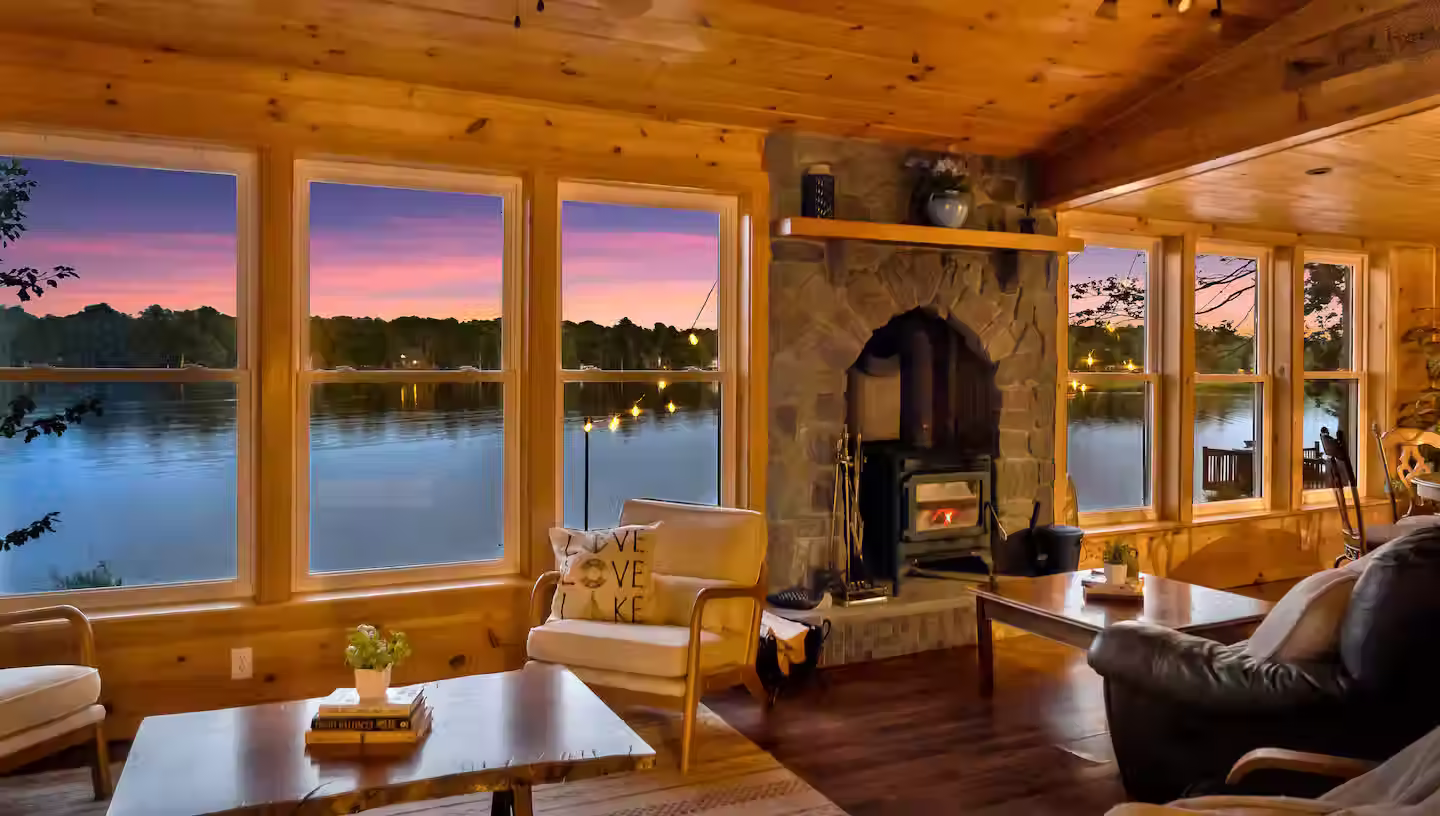 Sun Room: beautiful and cozy, overlooking the lake with big windows, wood fire place (wood not supplied), comfy couches and another table with seating for 5.